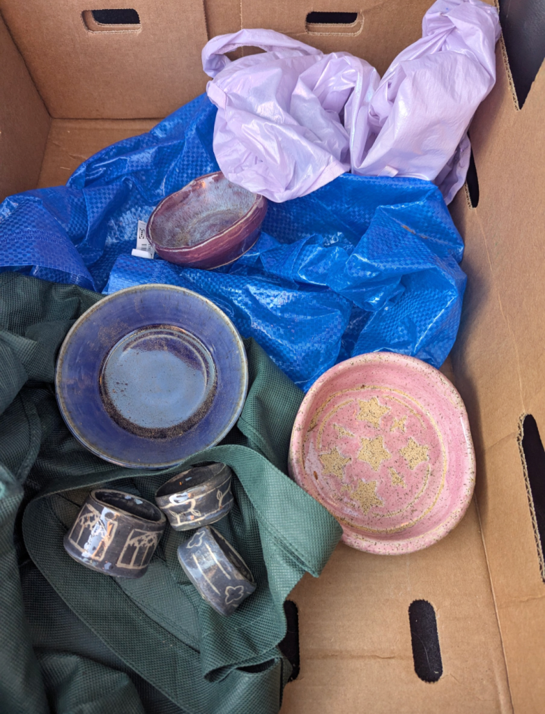 Pieces I made in Beginning Pottery: 2 small bowls, a catch all tray, and some tiny gothic cups